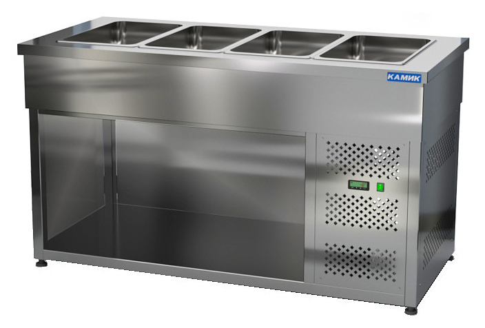 Холодильный стол КАМИК СОН-115000 используется на предприятиях общественного питания и торговли для охлаждения, демонстрации и кратковременного хранения ингредиентов для приготовления салатов, напитков и готовых блюд. Конструкция имеет модульное строение и разделена на секции, каждая секция с дверью оборудована сетчатой полкой и парой направляющих. Корпус выполнен из нержавеющей стали.