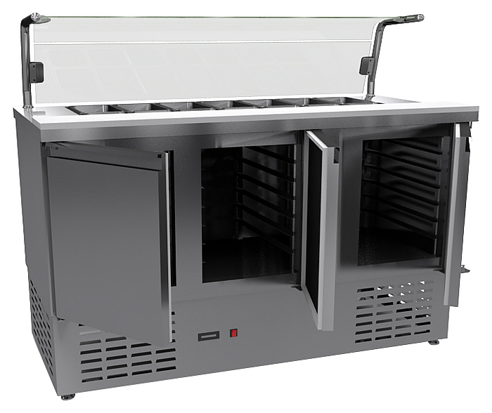 Холодильный стол КАМИК СОН-1150317 используется на предприятиях общественного питания и торговли для охлаждения, демонстрации и кратковременного хранения ингредиентов для приготовления салатов, напитков и готовых блюд. Конструкция имеет модульное строение и разделена на секции, каждая из которых оборудована сетчатой полкой и парой направляющих. Корпус выполнен из нержавеющей стали.