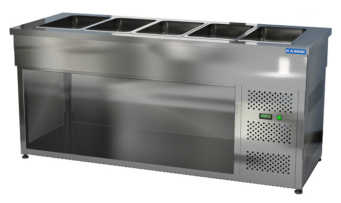 Холодильный стол КАМИК СОН-118500 используется на предприятиях общественного питания и торговли для охлаждения, демонстрации и кратковременного хранения ингредиентов для приготовления салатов, напитков и готовых блюд. Конструкция имеет модульное строение и разделена на секции, каждая секция с дверью оборудована сетчатой полкой и парой направляющих. Корпус выполнен из нержавеющей стали.