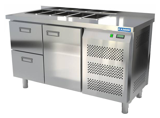 Холодильный стол КАМИК СОН-121466 используется на предприятиях общественного питания и торговли для охлаждения, демонстрации и кратковременного хранения ингредиентов для приготовления салатов, напитков и готовых блюд. Конструкция разделена на секции, каждая секция с дверью оборудована сетчатой полкой и парой направляющих. Корпус выполнен из нержавеющей стали AISI 430 толщиной 1 мм, столешница - из нержавеющей стали AISI 304 толщиной 1,5 мм.