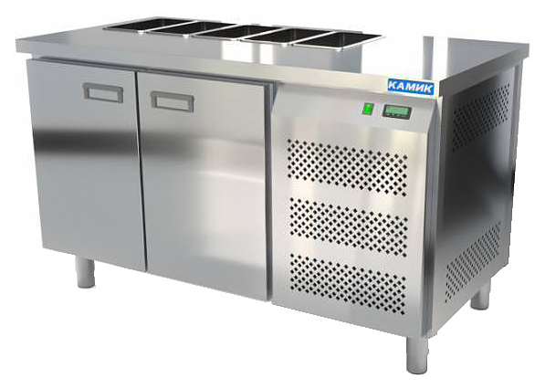 Холодильный стол КАМИК СОН-201463К используется на предприятиях общественного питания и торговли для охлаждения, демонстрации и кратковременного хранения ингредиентов для приготовления салатов, напитков и готовых блюд. Конструкция разделена на секции, каждая секция с дверью оборудована сетчатой полкой и парой направляющих. Корпус выполнен из нержавеющей стали AISI 430 толщиной 1 мм, столешница - из нержавеющей стали AISI 304 толщиной 1,5 мм.