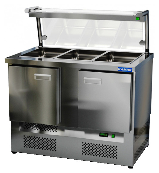 Холодильный стол КАМИК СОН-211041 используется на предприятиях общественного питания и торговли для охлаждения, демонстрации и кратковременного хранения ингредиентов для приготовления салатов, напитков и готовых блюд. Конструкция имеет модульное строение и разделена на секции, каждая секция с дверью оборудована сетчатой полкой и парой направляющих. Корпус выполнен из нержавеющей стали.