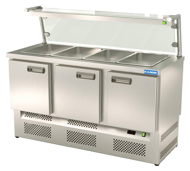 Холодильный стол КАМИК СОН-215051 используется на предприятиях общественного питания и торговли для охлаждения, демонстрации и кратковременного хранения ингредиентов для приготовления салатов, напитков и готовых блюд. Конструкция имеет модульное строение и разделена на секции, каждая секция с дверью оборудована сетчатой полкой и парой направляющих. Корпус выполнен из нержавеющей стали.