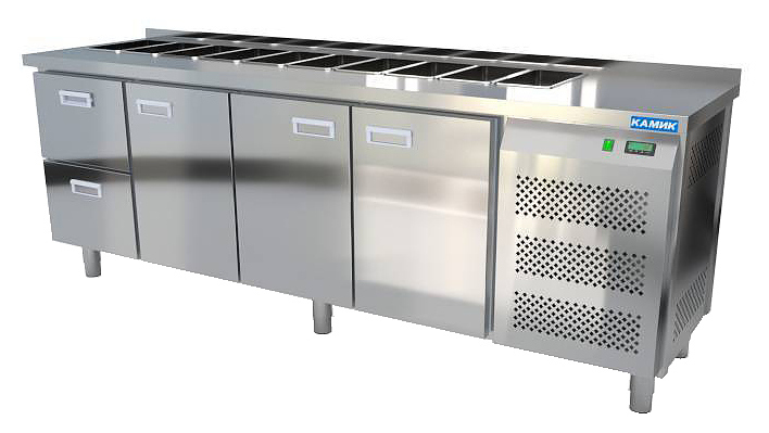 Холодильный стол КАМИК СОН-322366К используется на предприятиях общественного питания и торговли для охлаждения, демонстрации и кратковременного хранения ингредиентов для приготовления салатов, напитков и готовых блюд. Конструкция разделена на секции, каждая секция с дверью оборудована сетчатой полкой и парой направляющих. Корпус выполнен из нержавеющей стали AISI 430 толщиной 1 мм, столешница - из нержавеющей стали AISI 304 толщиной 1,5 мм.