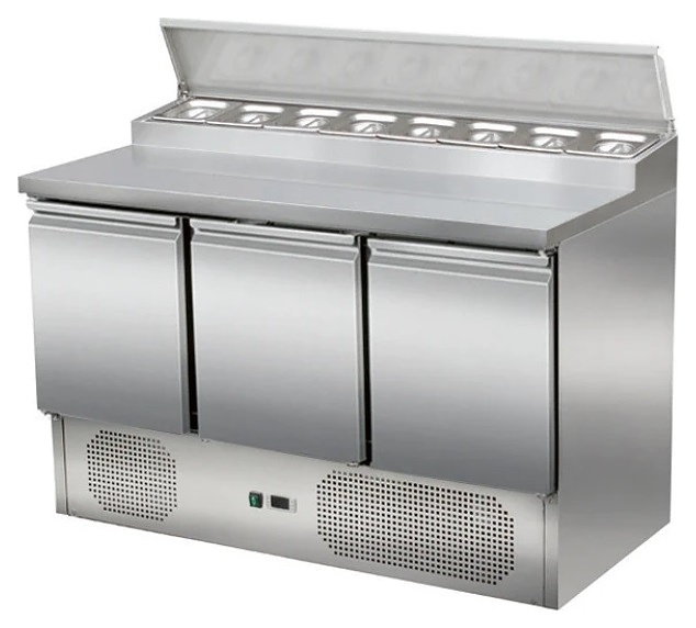 Холодильный стол Koreco PS/300 предназначен для обработки ингридиентов для салатов и кратковременного хранения предварительно охлажденных пищевых продуктов на предприятиях общественного питания и торговли. Модель оснащена расположенным снизу встроенным холодильным агрегатом, 3 холодильными секциями с распашными дверьми, салат-баром с откидной крышкой и электронным блоком управления. Корпус выполнен из высококачественной нержавеющей стали марки AISI201, полки – из металла с полимерным покрытием.