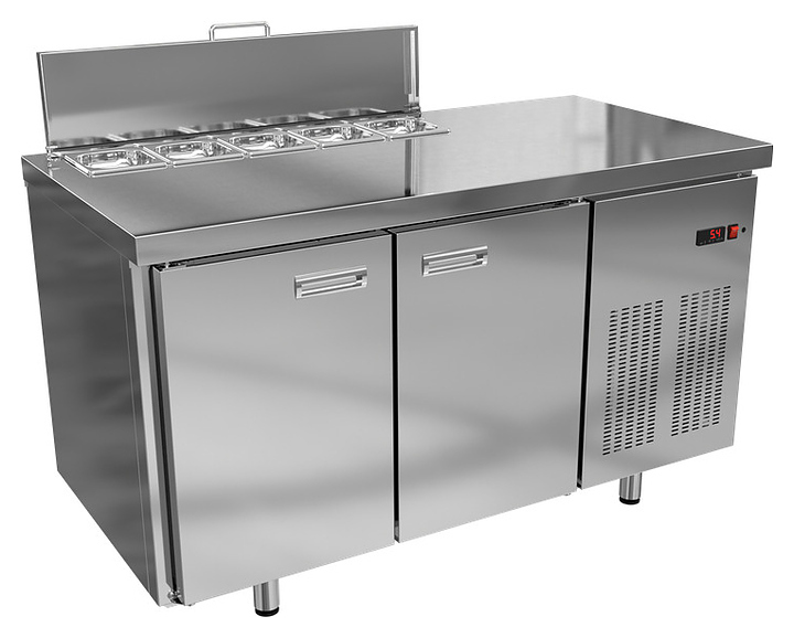 Холодильный стол KRONER СХС 2-140-70 предназначен для обработки и сохранения свежести ингредиентов для холодных закусок и салатов на предприятиях общественного питания и торговли. Модель оснащена встроенным компрессорным холодильным агрегатом с боковым расположением, столешницей без борта, интегрированным в столешницу салат-баром с откидной крышкой для размещения гастроемкостей, электронной панелью управления и холодильной камерой с 2 секциями с распашными дверьми. Корпус и столешница выполнены из шлифованной нержавеющей стали, задняя стенка – из оцинкованной стали.