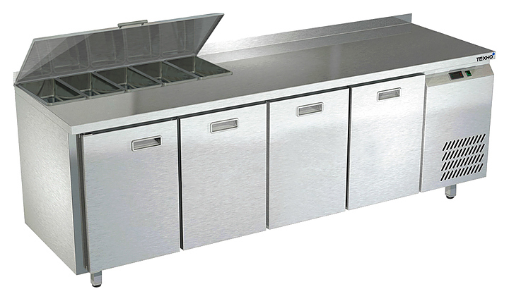 Холодильный стол Техно-ТТ СПБ/С-227/13-1307 предназначен для обработки ингредиентов, используемых для приготовления салатов, охлаждения и кратковременного хранения продуктов на предприятиях общественного питания и торговли. Каждая секция оснащена направляющими и сетчатой полкой, дверь и ящики - доводчиками. Корпус выполнен из нержавеющей стали, задняя стенка - из оцинкованной стали.