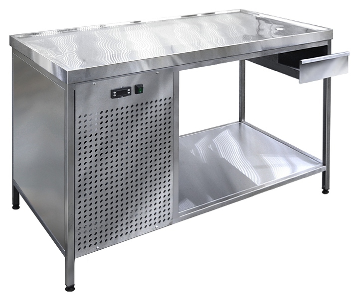 Холодильный стол Finist СХСо-1300-600 предназначен для разделки полуфабрикатов мяса и рыбы, а также для демонстрации и выкладки продуктов на предприятиях общественного питания и торговли. Модель оснащена расположенным сбоку агрегатным отсеком, столешницей повышенной прочности с охлаждаемой поверхностью, открытой полкой для хранения инвентаря, выдвижным ящиком-лотком, устойчивыми ножками с подпятниками, кабелем питания с евровилкой и кнопочной панелью управления с цифровым дисплеем. Корпус выполнен из высококачественной нержавеющей стали.