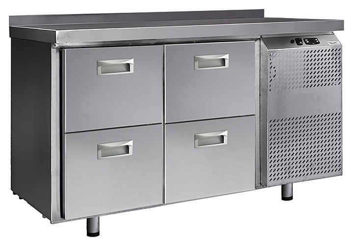 Холодильный стол Finist СХС-600-0/4 предназначен для хранения предварительно охлажденных мясных и рыбных полуфабрикатов, заготовок для салатов, молочной продукции, охлажденных напитков и других пищевых продуктов на предприятиях общественного питания и торговли. Модель оснащена расположенным сбоку агрегатным отсеком, столешницей с задним бортом, 4 выдвижными ящиками, устойчивыми ножками с подпятниками, кабелем питания с евровилкой и кнопочной панелью управления с цифровым дисплеем. Корпус выполнен из высококачественной нержавеющей стали.