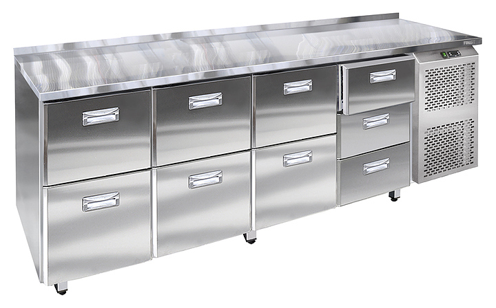 Холодильный стол Finist СХС-600-0/9(4С) предназначен для хранения пищевых продуктов и напитков на предприятиях общественного питания, торговли и пищевых производствах. Модель оснащена 9 выдвижными ящиками с доводчиками, обеспечивающими гарантированное закрытие и поддержание заданной температуры в рабочем объеме стола. Передняя панель моторного отсека имеет большую площадь перфорации, что позволяет обеспечить холодильному агрегату поступление воздуха для охлаждения. Изделие выполнено из высококачественной пищевой нержавеющей стали, которая отличается прочностью и долговечностью, не впитывает загрязнения и легко очищается.