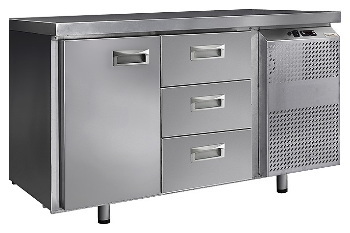 Холодильный стол Finist СХС-600-1/3 предназначен для хранения предварительно охлажденных мясных и рыбных полуфабрикатов, заготовок для салатов, молочной продукции, охлажденных напитков и других пищевых продуктов на предприятиях общественного питания и торговли. Модель оснащена расположенным сбоку агрегатным отсеком, столешницей с задним бортом, холодильной камерой с распашной дверцей, 3 выдвижными ящиками, устойчивыми ножками с подпятниками, кабелем питания с евровилкой и кнопочной панелью управления с цифровым дисплеем. Корпус выполнен из высококачественной нержавеющей стали.