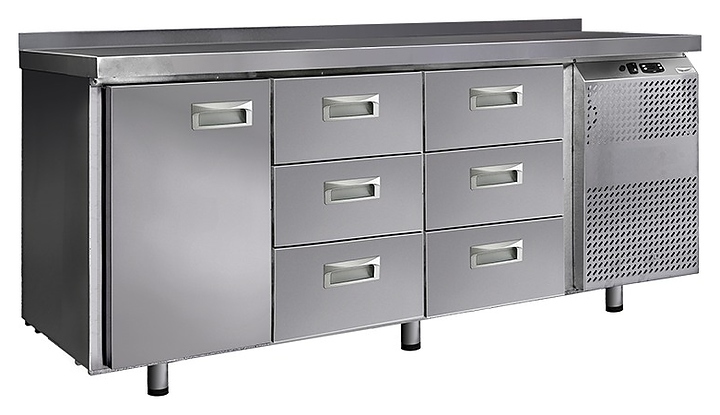 Холодильный стол Finist СХС-600-1/6 предназначен для хранения предварительно охлажденных мясных и рыбных полуфабрикатов, заготовок для салатов, молочной продукции, охлажденных напитков и других пищевых продуктов на предприятиях общественного питания и торговли. Модель оснащена расположенным сбоку агрегатным отсеком, столешницей с задним бортом, холодильной камерой с распашной дверцей, 6 выдвижными ящиками, устойчивыми ножками с подпятниками, кабелем питания с евровилкой и кнопочной панелью управления с цифровым дисплеем. Корпус выполнен из высококачественной нержавеющей стали.