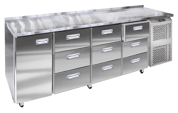 Холодильный стол Finist СХС-600-1/9 предназначен для хранения пищевых продуктов и напитков на предприятиях общественного питания, торговли и пищевых производствах. Модель оснащена распашной дверью и 9 выдвижными ящиками с доводчиками, обеспечивающими гарантированное закрытие и поддержание заданной температуры в рабочем объеме стола. Передняя панель моторного отсека имеет большую площадь перфорации, что позволяет обеспечить холодильному агрегату поступление воздуха для охлаждения. Изделие выполнено из высококачественной пищевой нержавеющей стали, которая отличается прочностью и долговечностью, не впитывает загрязнения и легко очищается.