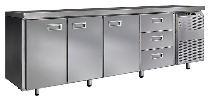 Холодильный стол Finist СХС-600-3/3, среднетемпературный, с боковым расположением агрегата предназначен для хранения предварительно охлажденных мясных и рыбных полуфабрикатов, заготовок для салатов, молочной продукции, охлажденных напитков и других пищевых продуктов на предприятиях общественного питания и торговли. Модель оснащена расположенным сбоку агрегатным отсеком, столешницей с задним бортом, 3 холодильными камерами с распашными дверцами, 3 выдвижными ящиками, устойчивыми ножками с подпятниками, кабелем питания с евровилкой и кнопочной панелью управления с цифровым дисплеем. Корпус выполнен из высококачественной нержавеющей стали.