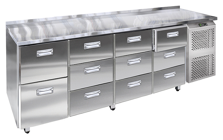 Холодильный стол Finist СХС-700-0/11 предназначен для хранения пищевых продуктов и напитков на предприятиях общественного питания, торговли и пищевых производствах. Модель оснащена 11 выдвижными ящиками с доводчиками, обеспечивающими гарантированное закрытие и поддержание заданной температуры в рабочем объеме стола. Передняя панель моторного отсека имеет большую площадь перфорации, что позволяет обеспечить холодильному агрегату поступление воздуха для охлаждения. Изделие выполнено из высококачественной пищевой нержавеющей стали, которая отличается прочностью и долговечностью, не впитывает загрязнения и легко очищается.