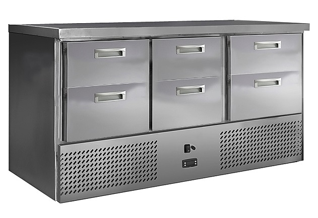 Холодильный стол Finist СХСн-700-4 предназначен для хранения предварительно охлажденных мясных и рыбных полуфабрикатов, заготовок для салатов, молочной продукции, охлажденных напитков и других пищевых продуктов на предприятиях общественного питания и торговли. Модель оснащена расположенным снизу агрегатным отсеком, столешницей, устойчивыми ножками с подпятниками, кабелем питания с евровилкой и кнопочной панелью управления с цифровым дисплеем. Корпус выполнен из высококачественной нержавеющей стали, задняя стенка - из оцинкованной стали.