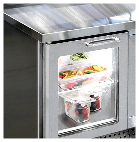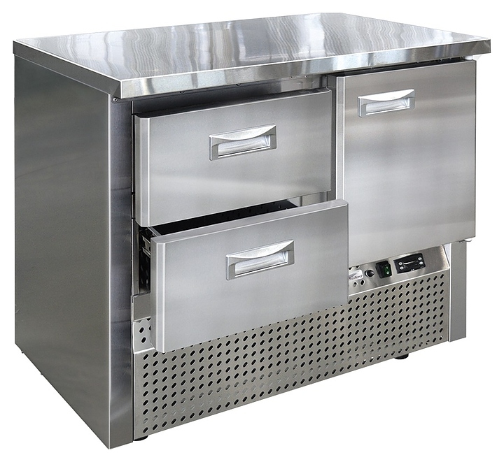 Холодильный стол Finist СХСн-700-1/2 предназначен для хранения предварительно охлажденных мясных и рыбных полуфабрикатов, заготовок для салатов, молочной продукции, охлажденных напитков и других пищевых продуктов на предприятиях общественного питания и торговли. Модель оснащена расположенным снизу агрегатным отсеком, столешницей, холодильной камерой с распашной дверцей, 2 выдвижными ящиками, устойчивыми ножками с подпятниками, кабелем питания с евровилкой и кнопочной панелью управления с цифровым дисплеем. Корпус выполнен из высококачественной нержавеющей стали.