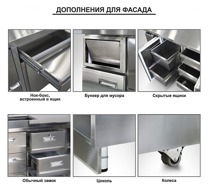 - Выдвижные ящики холодильного стола снабжены доводчиками