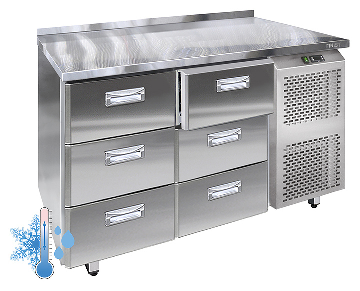 Универсальный холодильный стол Finist УХС-600-0/6 предназначен для хранения пищевых продуктов и напитков на предприятиях общественного питания, торговли и пищевых производствах. Модель оснащена 6 выдвижными ящиками с направляющими, обеспечивающими гарантированное закрытие и поддержание заданной температуры в рабочем объеме стола. Передняя панель моторного отсека имеет большую площадь перфорации, что позволяет обеспечить холодильному агрегату поступление воздуха для охлаждения. Изделие выполнено из высококачественной пищевой нержавеющей стали, которая отличается прочностью и долговечностью, не впитывает загрязнения и легко очищается.