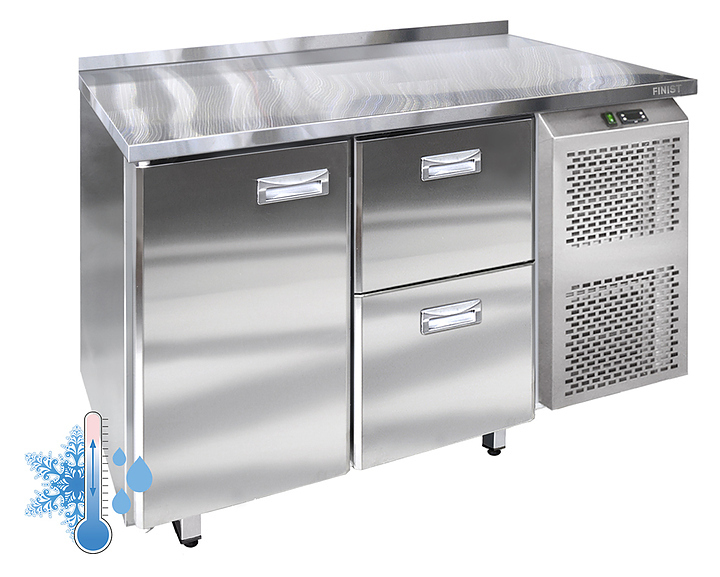 Универсальный холодильный стол Finist УХС-600-1/2 предназначен для хранения пищевых продуктов и напитков на предприятиях общественного питания, торговли и пищевых производствах. Модель оснащена распашной дверью и 2 выдвижными ящиками с доводчиками, обеспечивающими гарантированное закрытие и поддержание заданной температуры в рабочем объеме стола. Передняя панель моторного отсека имеет большую площадь перфорации, что позволяет обеспечить холодильному агрегату поступление воздуха для охлаждения. Изделие выполнено из высококачественной пищевой нержавеющей стали, которая отличается прочностью и долговечностью, не впитывает загрязнения и легко очищается.
