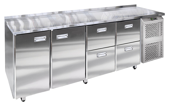 Холодильный стол Finist УХС-600-2/4 предназначен для хранения предварительно охлажденных мясных и рыбных полуфабрикатов, заготовок для салатов, молочной продукции, охлажденных напитков и других пищевых продуктов на предприятиях общественного питания и торговли. Модель оснащена расположенным сбоку агрегатным отсеком, 2 секциями с распашными дверьми, 4 выдвижными ящиками с доводчиками, устойчивыми опорами, кабелем питания и панелью управления с цифровым дисплеем. Корпус выполнен из высококачественной нержавеющей стали.