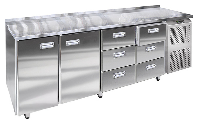 Холодильный стол Finist УХС-600-2/6 предназначен для хранения предварительно охлажденных мясных и рыбных полуфабрикатов, заготовок для салатов, молочной продукции, охлажденных напитков и других пищевых продуктов на предприятиях общественного питания и торговли. Модель оснащена расположенным сбоку агрегатным отсеком, 2 секциями с распашными дверьми, 6 выдвижными ящиками с доводчиками, устойчивыми опорами, кабелем питания и панелью управления с цифровым дисплеем. Корпус выполнен из высококачественной нержавеющей стали.