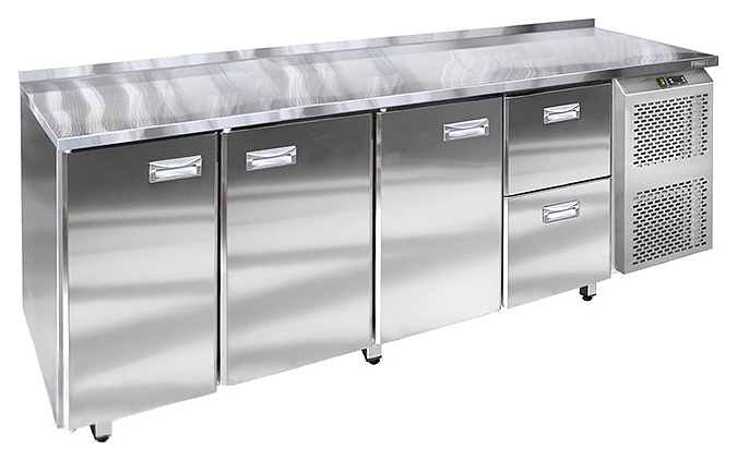 Холодильный стол Finist УХС-600-3/2 предназначен для хранения предварительно охлажденных мясных и рыбных полуфабрикатов, заготовок для салатов, молочной продукции, охлажденных напитков и других пищевых продуктов на предприятиях общественного питания и торговли. Модель оснащена расположенным сбоку агрегатным отсеком, 3 секциями с распашными дверьми, секцией с 2 выдвижными ящиками с доводчиками, устойчивыми опорами, кабелем питания и панелью управления с цифровым дисплеем. Корпус выполнен из высококачественной нержавеющей стали.