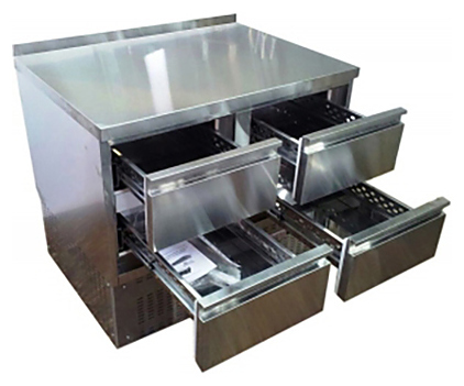 Холодильный стол Gastrolux СОН2Б-097/4Я/S серии Standart предназначен для раскатки теста и обработки ингредиентов для приготовления блюд, охлаждения и кратковременного хранения скоропортящихся продуктов и напитков на предприятиях общественного питания и торговли. Модель оснащена 4 выдвижными ящиками и 4 ножками. Корпус выполнен из нержавеющей стали AISI 430, задняя стенка - из оцинкованной стали.