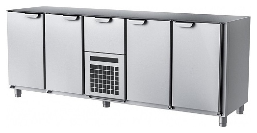 Холодильный стол HappyChef TC B 1-1-CBR-1-1 предназначен для хранения предварительно охлажденных пищевых продуктов и напитков на предприятиях общественного питания и торговли. Модель оснащена секцией с компрессорным холодильным агрегатом со съемной холодильной кассетой (Россия) с нижним центральным расположением и верхним выдвижным ящиком, 2 секциями справа и 2 секциями слева с глухой распашной дверью в каждой и электронной панелью управления, двери и ящик имеют короткие горизонтальные рукоятки в верхней части. Корпус выполнен из нержавеющей стали марки AISI 430.