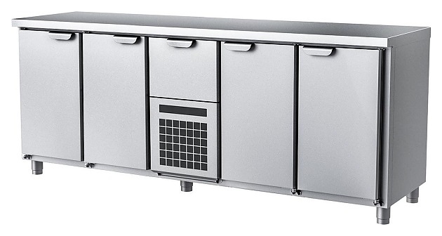 Холодильный стол HappyChef TC BD 1-1-CBR-1-1 предназначен для хранения предварительно охлажденных пищевых продуктов и напитков, а также обработки ингредиентов в процессе приготовления блюд на предприятиях общественного питания и торговли. Модель оснащена секцией с компрессорным холодильным агрегатом со съемной холодильной кассетой (Россия) с нижним центральным расположением и верхним выдвижным ящиком, 2 секциями справа и 2 секциями слева с глухой распашной дверью в каждой, усиленной столешницей без борта и электронной панелью управления, двери и ящик имеют короткие горизонтальные рукоятки в верхней части. Корпус выполнен из нержавеющей стали марки AISI 430, столешница – из нержавеющей стали марки AISI 304.