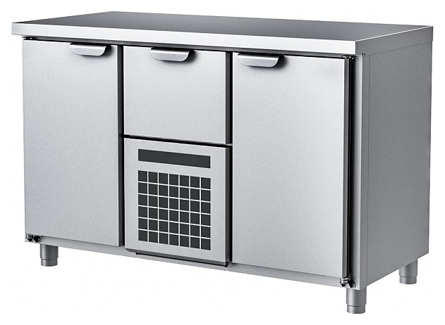 Холодильный стол HappyChef TC BD 1-CBR-1 предназначен для хранения предварительно охлажденных пищевых продуктов и напитков, а также обработки ингредиентов в процессе приготовления блюд на предприятиях общественного питания и торговли. Модель оснащена секцией с компрессорным холодильным агрегатом со съемной холодильной кассетой (Россия) с нижним центральным расположением и верхним выдвижным ящиком, 1 секцией справа и 1 секцией слева с глухой распашной дверью в каждой, усиленной столешницей без борта и электронной панелью управления, двери и ящик имеют короткие горизонтальные рукоятки в верхней части. Корпус выполнен из нержавеющей стали марки AISI 430, столешница – из нержавеющей стали марки AISI 304.