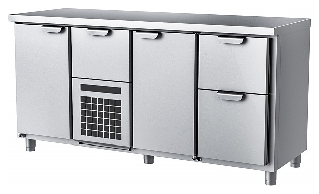 Холодильный стол HappyChef TC BD 1-CBR-1-2 предназначен для хранения предварительно охлажденных пищевых продуктов и напитков, а также обработки ингредиентов в процессе приготовления блюд на предприятиях общественного питания и торговли. Модель оснащена секцией с компрессорным холодильным агрегатом со съемной холодильной кассетой (Россия) с нижним центральным расположением и верхним выдвижным ящиком, 2 секциями справа: с глухой распашной дверью и 2 выдвижными ящиками, секцией слева с глухой распашной дверью, усиленной столешницей без борта и электронной панелью управления, двери и ящики имеют короткие горизонтальные рукоятки в верхней части. Корпус выполнен из нержавеющей стали марки AISI 430, столешница – из нержавеющей стали марки AISI 304.