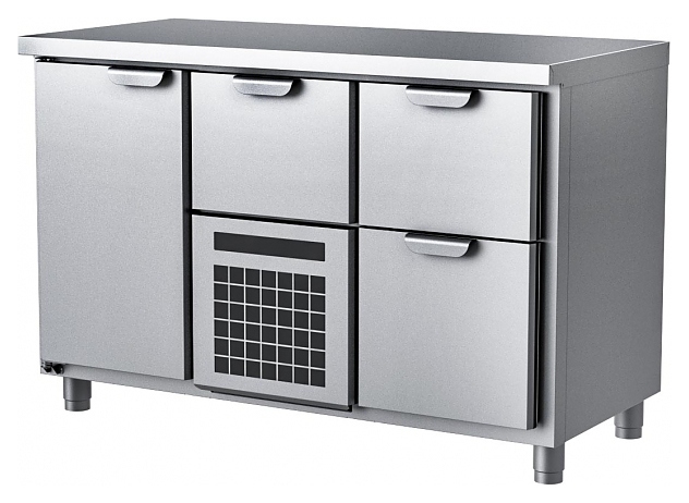 Холодильный стол HappyChef TC GH 1-CBR-2 предназначен для хранения предварительно охлажденных мясных и рыбных полуфабрикатов, заготовок для салатов, молочной продукции, охлажденных напитков и других пищевых продуктов на предприятиях общественного питания и торговли. Модель оснащена глухой распашной дверью с решетчатой полкой, верхним выдвижным ящиком и 2 выдвижными ящиками справа, центральным холодильным агрегатом со съемной холодильной кассетой и и моющимся фильтром. Корпус выполнен из нержавеющей стали AISI 430, усиленная столешница - из нержавеющей стали AISI 304 толщиной 2 мм.