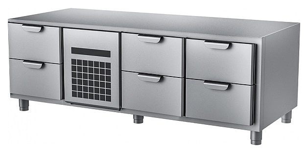 Холодильный стол HappyChef TC L 2-CR-2-2 предназначен для хранения предварительно охлажденных пищевых продуктов на предприятиях общественного питания и торговли. Модель оснащена центральной секцией с компрессорным холодильным агрегатом со съемной холодильной кассетой (Россия), 2 секциями справа и 1 секцией слева с 2 выдвижными ящиками в каждой и электронной панелью управления, ящики имеют короткие горизонтальные рукоятки в верхней части. Корпус выполнен из нержавеющей стали марки AISI 430.