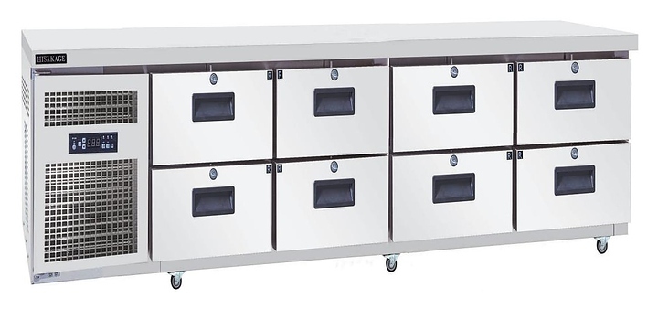 Холодильный стол HISAKAGE CL-225 используется на предприятиях общественного питания и торговли для обработки ингредиентов для приготовления блюд, а также кратковременного хранения скоропортящихся продуктов и напитков. Модель оснащена 8 ящиками. Корпус выполнен из нержавеющей стали AISI 201.