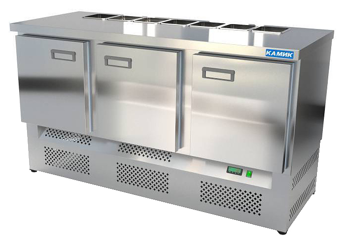 Холодильный стол КАМИК СОН-301576КН используется на предприятиях общественного питания и торговли для охлаждения, демонстрации и кратковременного хранения ингредиентов для приготовления салатов, напитков и готовых блюд. Конструкция разделена на секции, каждая секция с дверью оборудована сетчатой полкой и парой направляющих. Корпус выполнен из нержавеющей стали AISI 430 толщиной 1 мм, столешница - из нержавеющей стали AISI 304 толщиной 1,5 мм.