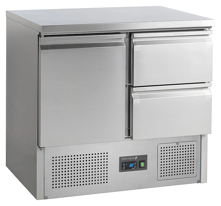 Холодильный стол TEFCOLD SA912 предназначен для обработки ингредиентов, используемых для приготовления салатов, охлаждения и кратковременного хранения скоропортящихся продуктов и напитков на предприятиях общественного питания и торговли. Прибор оснащен компрессором, градусником, 2 ящиками GN 1/1, полкой GN 1/1 и регулируемыми ножками. Корпус и внутренняя отделка выполнены из нержавеющей стали.