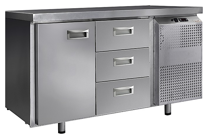 Морозильный стол Finist НХС-600-1/3 предназначен для хранения предварительно замороженных пищевых продуктов на предприятиях общественного питания и торговли. Модель оснащена расположенным сбоку агрегатным отсеком, столешницей с задним бортом, холодильной камерой с распашной дверцей, 3 выдвижными ящиками, устойчивыми ножками с подпятниками, кабелем питания с евровилкой и кнопочной панелью управления с цифровым дисплеем. Цельнозаливной корпус выполнен из высококачественной нержавеющей стали.