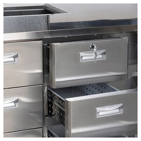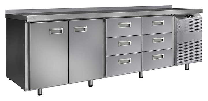 Морозильный стол Finist НХС-600-2/6 предназначен для хранения предварительно замороженных пищевых продуктов на предприятиях общественного питания и торговли. Модель оснащена расположенным сбоку агрегатным отсеком, столешницей с задним бортом, 2 холодильными камерами с распашными дверцами, 6 выдвижными ящиками, устойчивыми ножками с подпятниками, кабелем питания с евровилкой и кнопочной панелью управления с цифровым дисплеем. Цельнозаливной корпус выполнен из высококачественной нержавеющей стали.