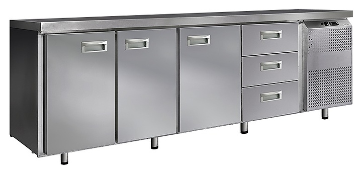 Морозильный стол Finist НХС-700-3/3 предназначен для хранения предварительно замороженных пищевых продуктов на предприятиях общественного питания и торговли. Модель оснащена расположенным сбоку агрегатным отсеком, столешницей, 3 холодильными камерами с распашными дверцами, 3 выдвижными ящиками, устойчивыми ножками с подпятниками, кабелем питания с евровилкой и кнопочной панелью управления с цифровым дисплеем. Цельнозаливной корпус выполнен из высококачественной нержавеющей стали.