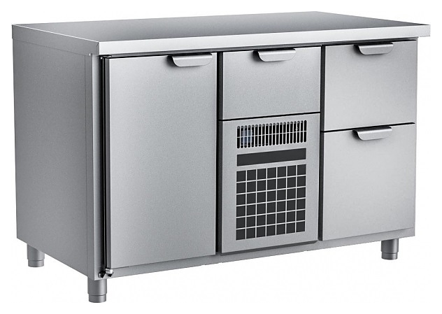 Морозильный стол HappyChef TF BD 1-FBR-2 предназначен для хранения предварительно замороженных пищевых продуктов и обработки ингредиентов в процессе приготовления блюд на предприятиях общественного питания и торговли. Модель оснащена секцией с компрессорным холодильным агрегатом со съемной холодильной кассетой (Россия) с нижним центральным расположением и верхним выдвижным ящиком, секцией с глухой распашной дверью слева и секцией с 2 выдвижными ящиками справа, усиленной столешницей без борта и электронной панелью управления, дверь и ящики имеют короткие горизонтальные рукоятки в верхней части. Корпус выполнен из нержавеющей стали марки AISI 430, столешница – из нержавеющей стали марки AISI 304.