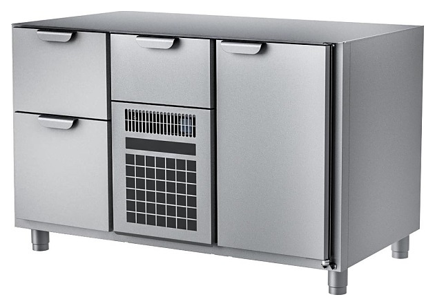 Морозильный стол HappyChef TF G 2-FBR-1 предназначен для хранения предварительно замороженных пищевых продуктов на предприятиях общественного питания и торговли. Модель оснащена секцией с компрессорным холодильным агрегатом со съемной холодильной кассетой (Россия) с нижним центральным расположением и верхним выдвижным ящиком, секцией с глухой распашной дверью справа и секцией с 2 выдвижными ящиками слева и электронной панелью управления, дверь и ящики имеют короткие горизонтальные рукоятки в верхней части. Корпус выполнен из нержавеющей стали марки AISI 430.