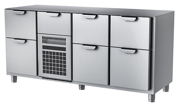 Морозильный стол HappyChef TF G 2-FBR-2-2 предназначен для хранения предварительно замороженных пищевых продуктов на предприятиях общественного питания и торговли. Модель оснащена секцией с компрессорным холодильным агрегатом со съемной холодильной кассетой (Россия) с нижним центральным расположением и верхним выдвижным ящиком, 1 секцией слева и 2 секциями справа с 2 выдвижными ящиками в каждой и электронной панелью управления, ящики имеют короткие горизонтальные рукоятки в верхней части. Корпус выполнен из нержавеющей стали марки AISI 430.