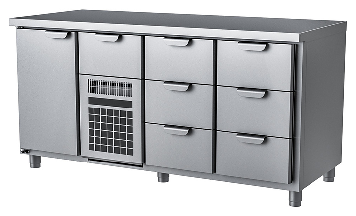 Морозильный стол HappyChef TF GH 1-FBR-3-3 предназначен для хранения предварительно замороженных пищевых продуктов и обработки ингредиентов в процессе приготовления блюд на предприятиях общественного питания и торговли. Модель оснащена секцией с компрессорным холодильным агрегатом со съемной холодильной кассетой (Россия) с нижним центральным расположением и верхним выдвижным ящиком, секцией с глухой распашной дверью справа и 2 секциями слева с 3 выдвижными ящиками в каждой, усиленной столешницей без борта и электронной панелью управления, дверь и ящики имеют короткие горизонтальные рукоятки в верхней части. Корпус выполнен из нержавеющей стали марки AISI 430, столешница – из нержавеющей стали марки AISI 304.
