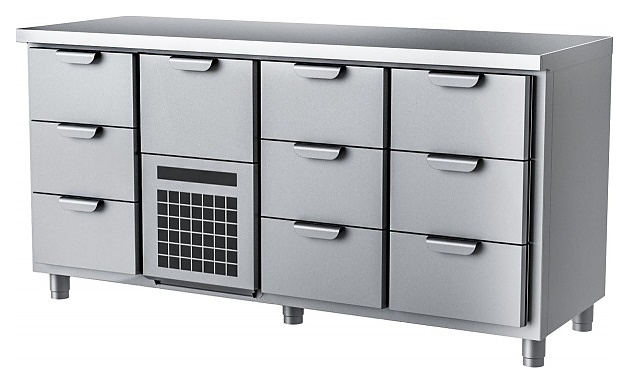 Морозильный стол HappyChef TF GH 3-FBR-3-3 предназначен для хранения предварительно замороженных пищевых продуктов и обработки ингредиентов в процессе приготовления блюд на предприятиях общественного питания и торговли. Модель оснащена секцией с компрессорным холодильным агрегатом со съемной холодильной кассетой (Россия) с нижним центральным расположением и верхним выдвижным ящиком, 2 секциями справа и 1 секцией слева с 3 выдвижными ящиками в каждой, усиленной столешницей без борта и электронной панелью управления, ящики имеют короткие горизонтальные рукоятки в верхней части. Корпус выполнен из нержавеющей стали марки AISI 430, столешница – из нержавеющей стали марки AISI 304.