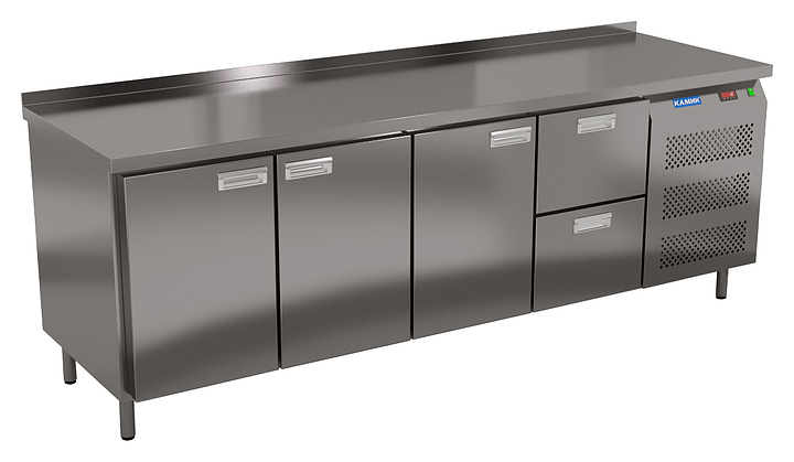 Морозильный стол КАМИК СМ-Т-32237 используется на предприятиях общественного питания и торговли для заморозки и длительного хранения продуктов, полуфабрикатов и мороженого, а также для установки теплового оборудования на него. Каждая секция с дверью, оснащена полкой сетчатой и парой направляющих. Корпус выполнен из нержавеющей стали AISI 430.