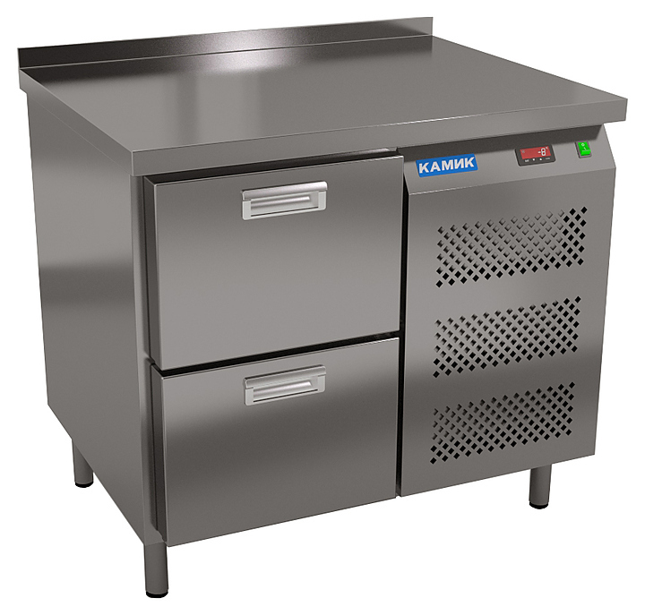 Морозильный стол КАМИК СМБ-0297 используется на предприятиях общественного питания и торговли для заморозки и длительного хранения продуктов, полуфабрикатов и мороженого. Конструкция разделена на секции, каждая секция с дверью оснащена полкой сетчатой и парой направляющих. Корпус выполнен из нержавеющей стали AISI 430 толщиной 1 мм, столешница - из нержавеющей стали AISI 304 толщиной 1,5 мм.