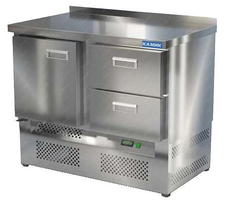 Морозильный стол КАМИК СМНБ-12107 используется на предприятиях общественного питания и торговли для заморозки и длительного хранения продуктов, полуфабрикатов и мороженого. Конструкция разделена на секции, каждая секция с дверью оснащена полкой сетчатой и парой направляющих. Корпус выполнен из нержавеющей стали AISI 430 толщиной 1 мм, столешница - из нержавеющей стали AISI 304 толщиной 1,5 мм.