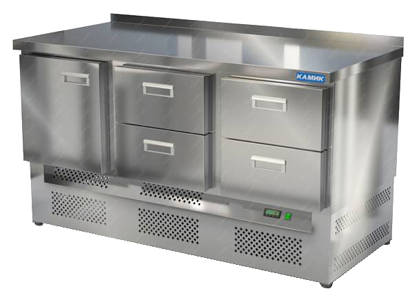 Морозильный стол КАМИК СМНБ-14158 используется на предприятиях общественного питания и торговли для заморозки и длительного хранения продуктов, полуфабрикатов и мороженого. Конструкция разделена на секции, каждая секция с дверью оснащена полкой сетчатой и парой направляющих. Корпус выполнен из нержавеющей стали AISI 430 толщиной 1 мм, столешница - из нержавеющей стали AISI 304 толщиной 1,5 мм.