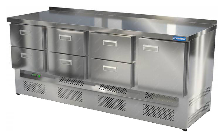 Морозильный стол КАМИК СМНБ-16208 используется на предприятиях общественного питания и торговли для заморозки и длительного хранения продуктов, полуфабрикатов и мороженого. Конструкция разделена на секции, каждая секция с дверью, оснащена полкой сетчатой и парой направляющих. Корпус выполнен из нержавеющей стали AISI 430 толщиной 1 мм, столешница - из нержавеющей стали AISI 304 толщиной 1,5 мм.